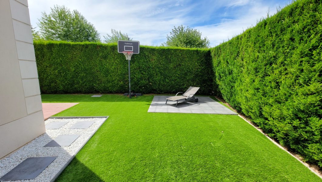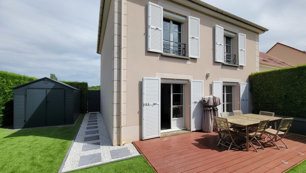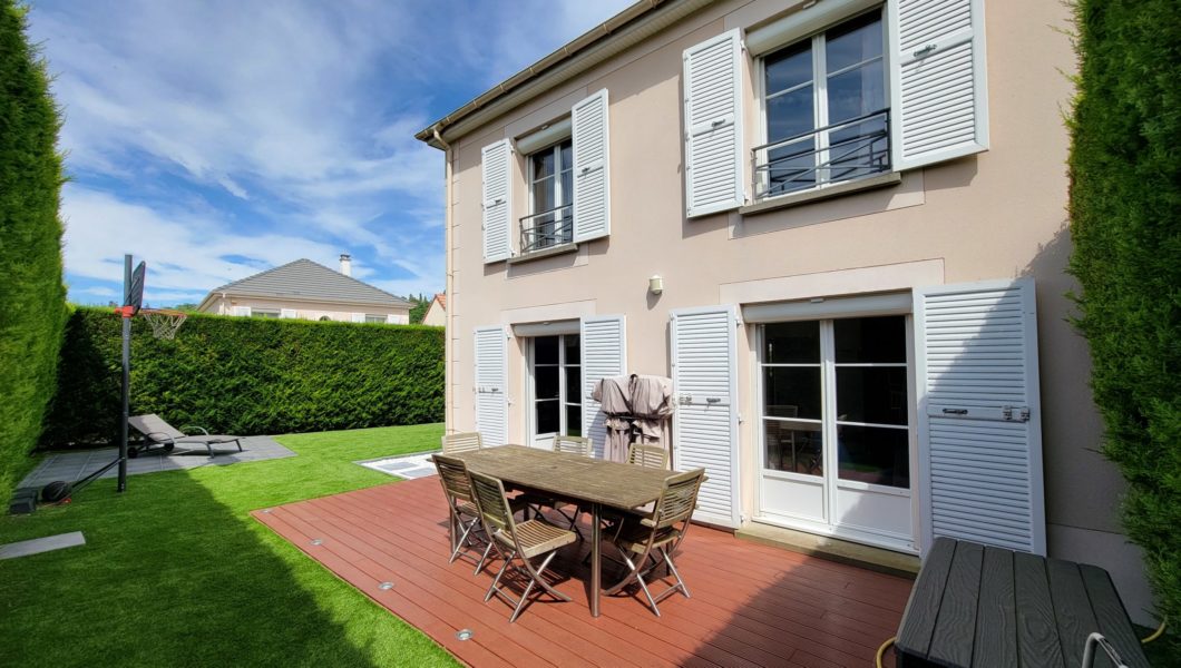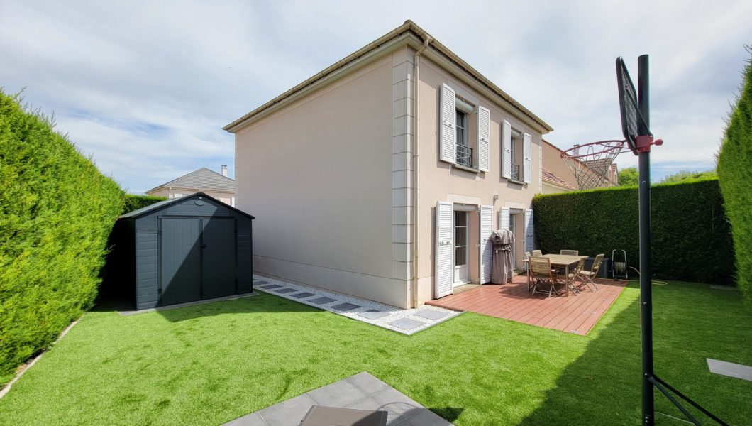 Jardin arrière et latéral au calme avec cabane de rangement, 2eme terrasse et pas de vis-à-vis. Exposition Est-Ouest.