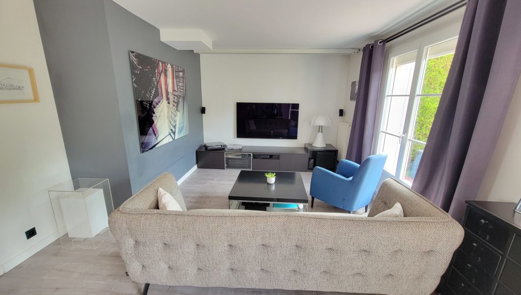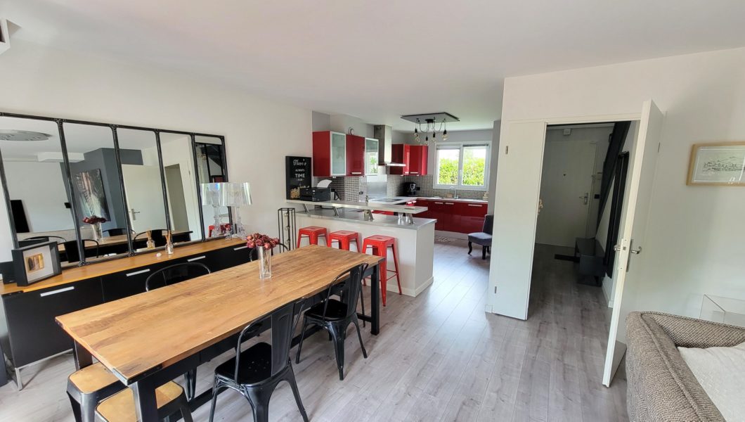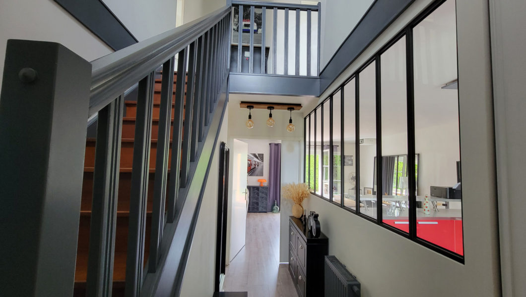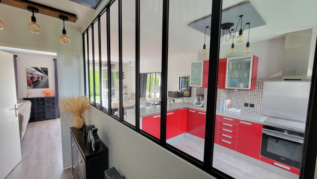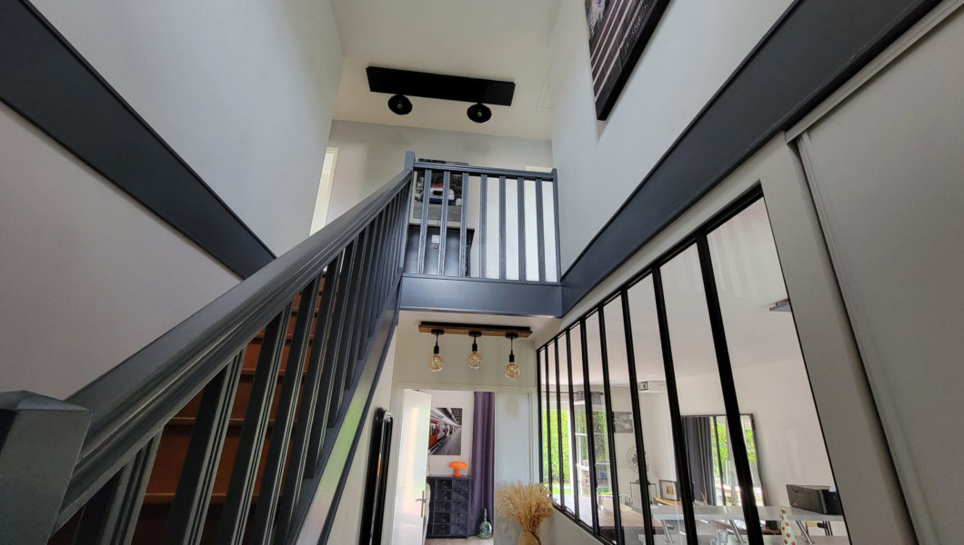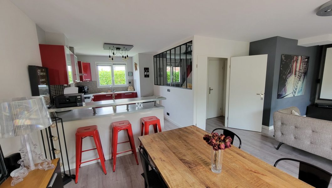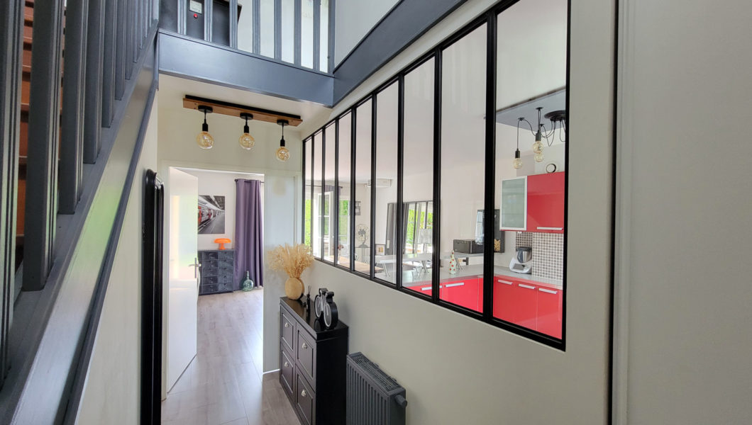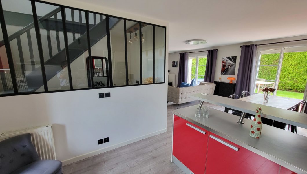 au rez de chaussée: Entrée Cathédrale avec placards et WC séparés avec lave mains et vitrage industriel donnant sur Cuisine ouverte équipée et Double-Séjour avec Home cinéma d’une valeur de 5000€ donnant sur terrasse arrière pour une pièce de vie de prés de 40 m2 et Garage,