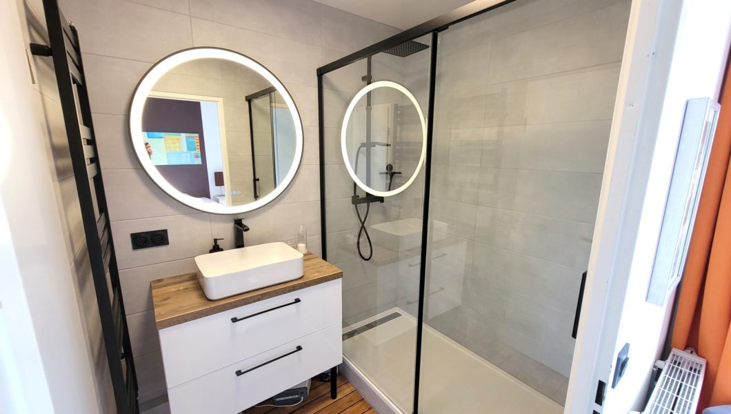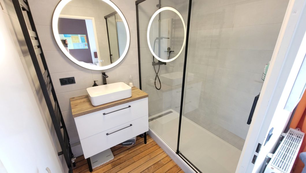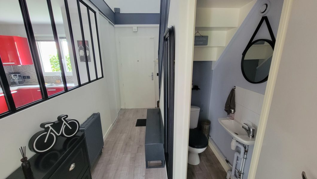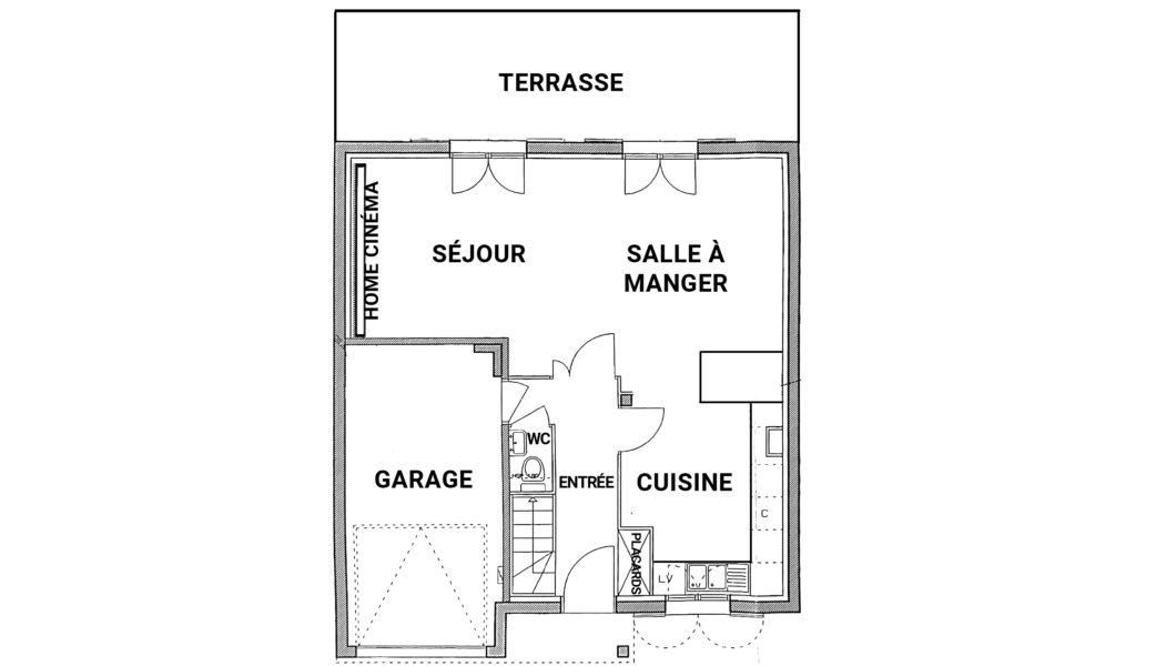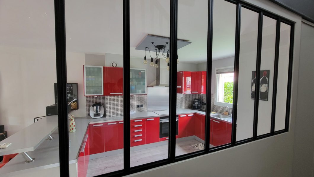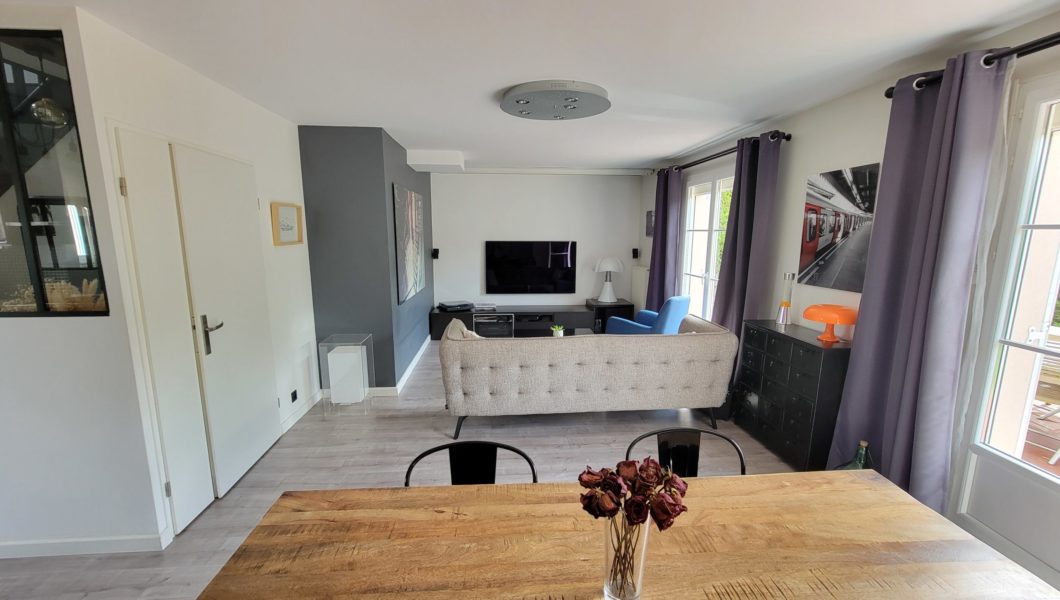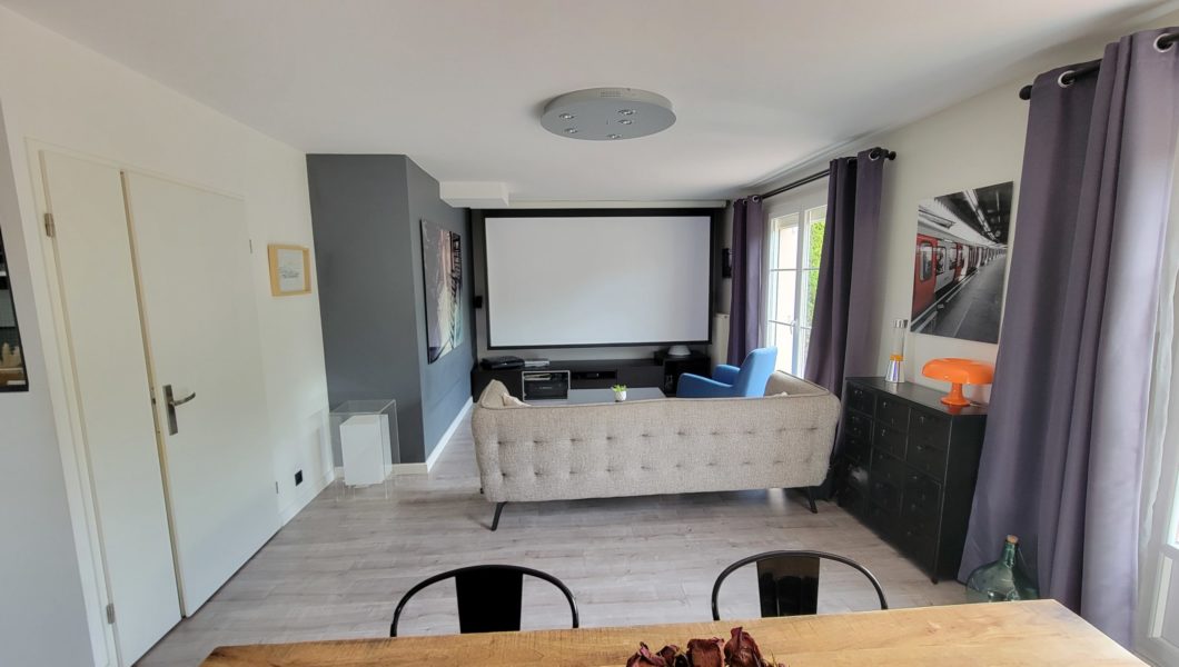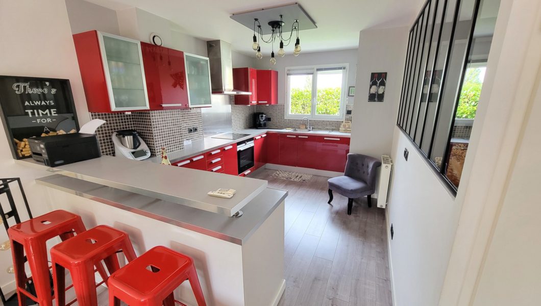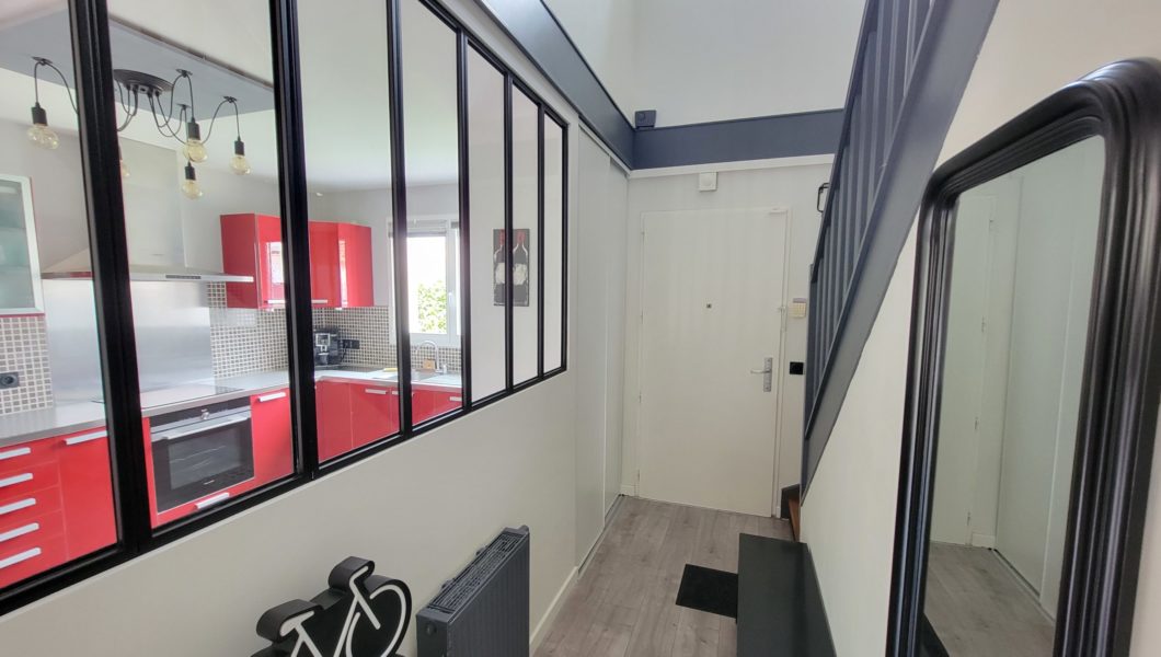 au rez de chaussée: Entrée Cathédrale avec placards et WC séparés avec lave mains et vitrage industriel donnant sur Cuisine ouverte équipée et Double-Séjour avec Home cinéma d’une valeur de 5000€ donnant sur terrasse arrière pour une pièce de vie de prés de 40 m2 et Garage,